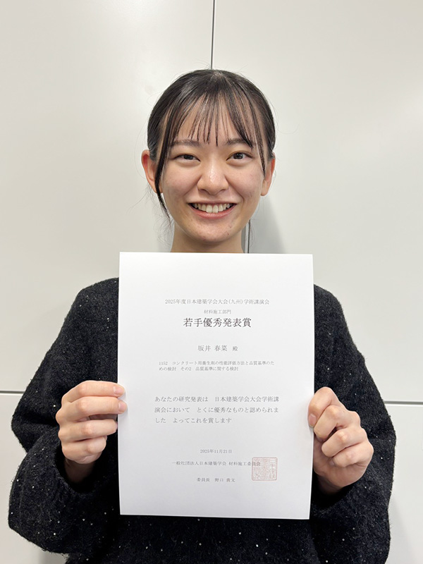 坂井春菜さん(修士1年生)が2025年度の日本建築学会大会(九州)学術講演会 材料施工部門にて若手優秀発表賞を受賞しました。おめでとうございます!!詳細は以下のURLをご確認ください。